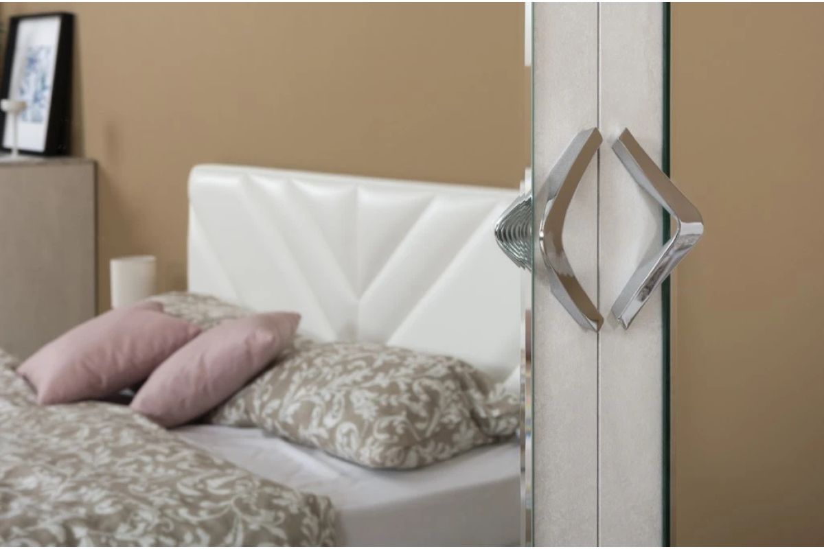 Фрезеровка на МДФ деталях и зеркалах подчеркивает форму ручек.